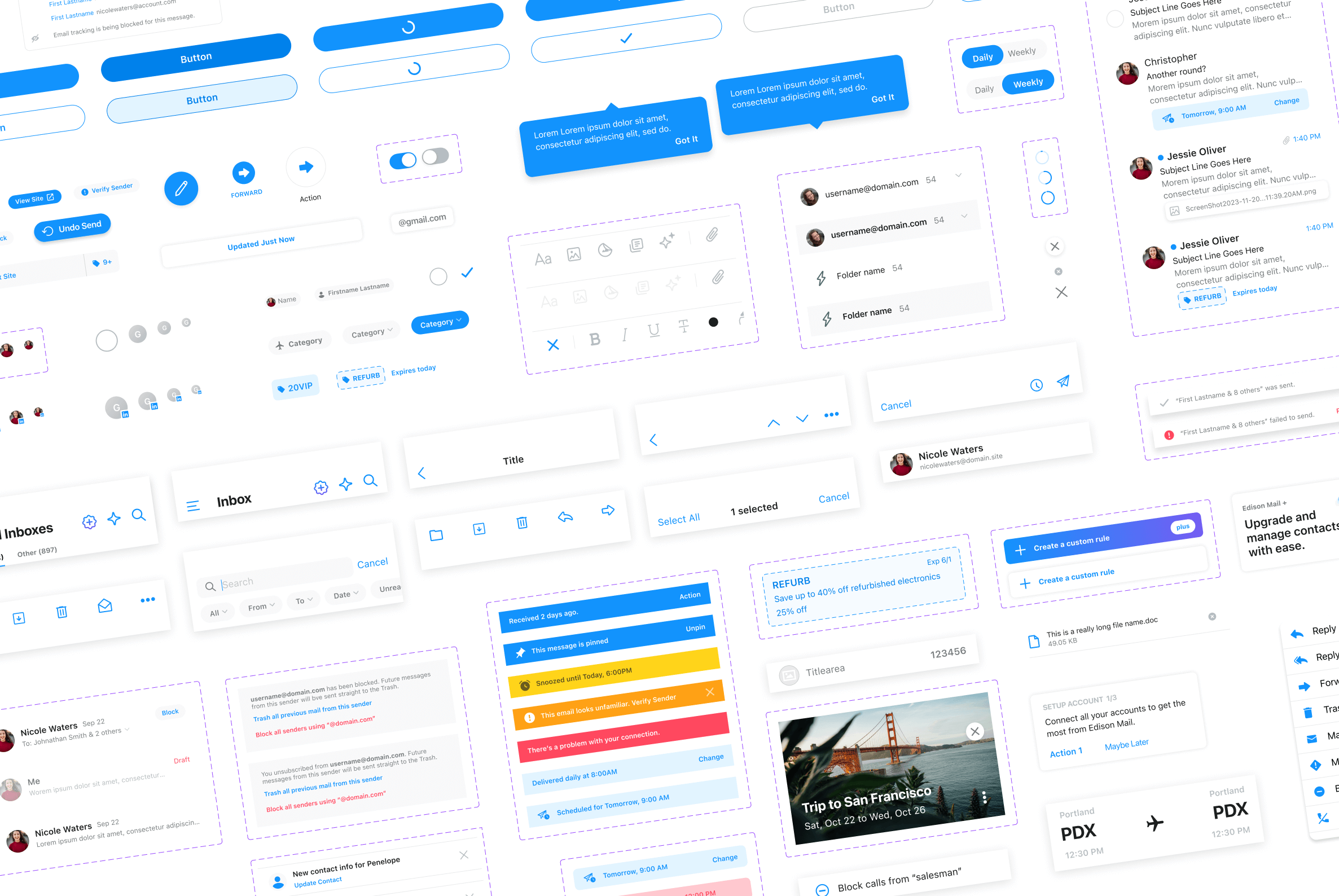 Design systems that span platforms create a shared knowledge base between engineering and product teams, enabling consistent, clean, and easy-to-use designs. Built on a 4px grid, with a cohesive color system, and typography styles, the Edison Mail design system consists of reusable elements that can be skinned according to placement and need, accommodating both light and dark system modes.